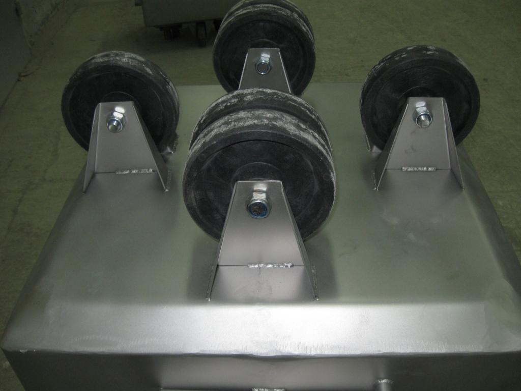 Сзади тележки установлена удобная ручка для транспортировки, усиленная кронштейном. Снизу днища установлены две пары колёс на кронштейнах с усиливающей крестовиной, причем поперечная пара колёс на 10 мм выше, что позволяет основную транспортировку производить на них, а продольные использовать как дополнительную опору- что значительно повышает её маневренность.