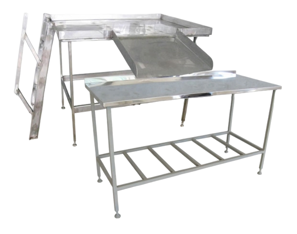 Стол для обвалки и жиловки предназначен для выполнения технологических операций по приёму мясного сырья в отрубах и четвертях, обвалки и жиловки. Благодаря встроенным лоткам и расположенным под столешницей направляющим с накопительными ёмкостями позволяет производить параллельно сортировку. Для осуществления тех. процесса на столешнице располагается технологическая доска из полипропилена толщиной 30 мм. Стол может быть изготовлен на 2, 3, 4 рабочих места, так-же имеется возможность компоновки из нескольких столов в любой конфигурации. Возможна установка разделительного экрана из нержавеющей стали. Стол состоит из сварного каркаса, выполненного из прямоугольного профиля 60х30, каркаса столешница, изготовленного из гнутого профиля толщиной 1,5 мм и столешницы, изготовленной из нержавеющей листовой стали толщиной 1,5 мм. Столешница имеет отгибы вверх с ребром жесткости и вмонтированными лотками для приема сырья после обвалки или жилки после жиловки. Количество лотков зависит от количества предполагаемых рабочих мест, обычно это три лотка. В передней части столешницы крепится разделочная доска из полипропилена толщиной 30 мм. В нижней части каркаса, на продольных и поперечных растяжках, под углом к горизонтальной плоскости крепятся направляющие для тары сбора отсортированного мясосырья. Ножки позволяют производить регулировку по высоте.