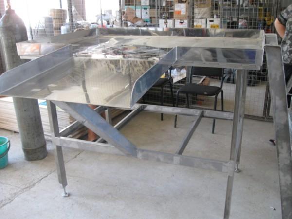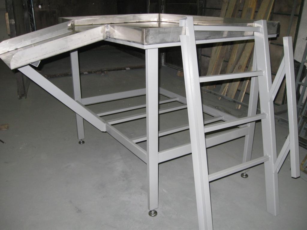 Стол СТ-14 предназначен для выполнения операции нутровки скота в цехах по первичной переработки и бойнях. Представляет собой жесткую конструкцию из чашеобразной столешницы из нержавеющей стали, толщиной 2 мм с отбортовкой, расположенной на каркасе столешницы, изготовленной из гнутого профиля. К раме столешницы крепятся ножки с распорками из прямоугольного профиля. Ножки имеют регулировку по высоте. В переднюю стенку вварен лоток-склиз под углом к горизонтальной плоскости-для выгрузки со стола продуктов после нутровки. В комплект входит навешиваемая лестница с поручнем.
