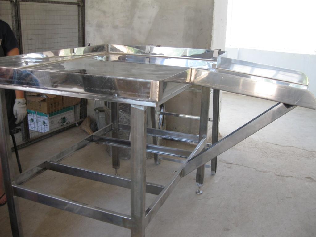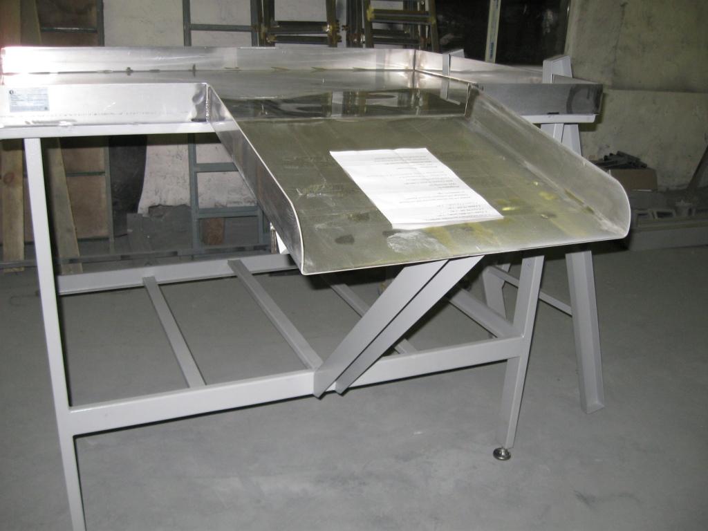 Стол СТ-14 предназначен для выполнения операции нутровки скота в цехах по первичной переработки и бойнях. Представляет собой жесткую конструкцию из чашеобразной столешницы из нержавеющей стали, толщиной 2 мм с отбортовкой, расположенной на каркасе столешницы, изготовленной из гнутого профиля. К раме столешницы крепятся ножки с распорками из прямоугольного профиля. Ножки имеют регулировку по высоте. В переднюю стенку вварен лоток-склиз под углом к горизонтальной плоскости-для выгрузки со стола продуктов после нутровки. В комплект входит навешиваемая лестница с поручнем.
